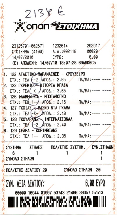 να εχει παιχτει ενα συστημα 1000 στηλες και να παρουσιαζεται μονο μια...(ΞΕΡΕΙΣ ΠΟΛΛΟΥΣ ΠΟΥ ΝΑ ΒΑΖΟΥΝ (300ΑΡΕΣ) ΕΥΡΩ ΜΑΛΑΚΑ ΜΟΥ ΑΥΤΗΝ ΤΗΝ ΕΠΟΧΗ)...???